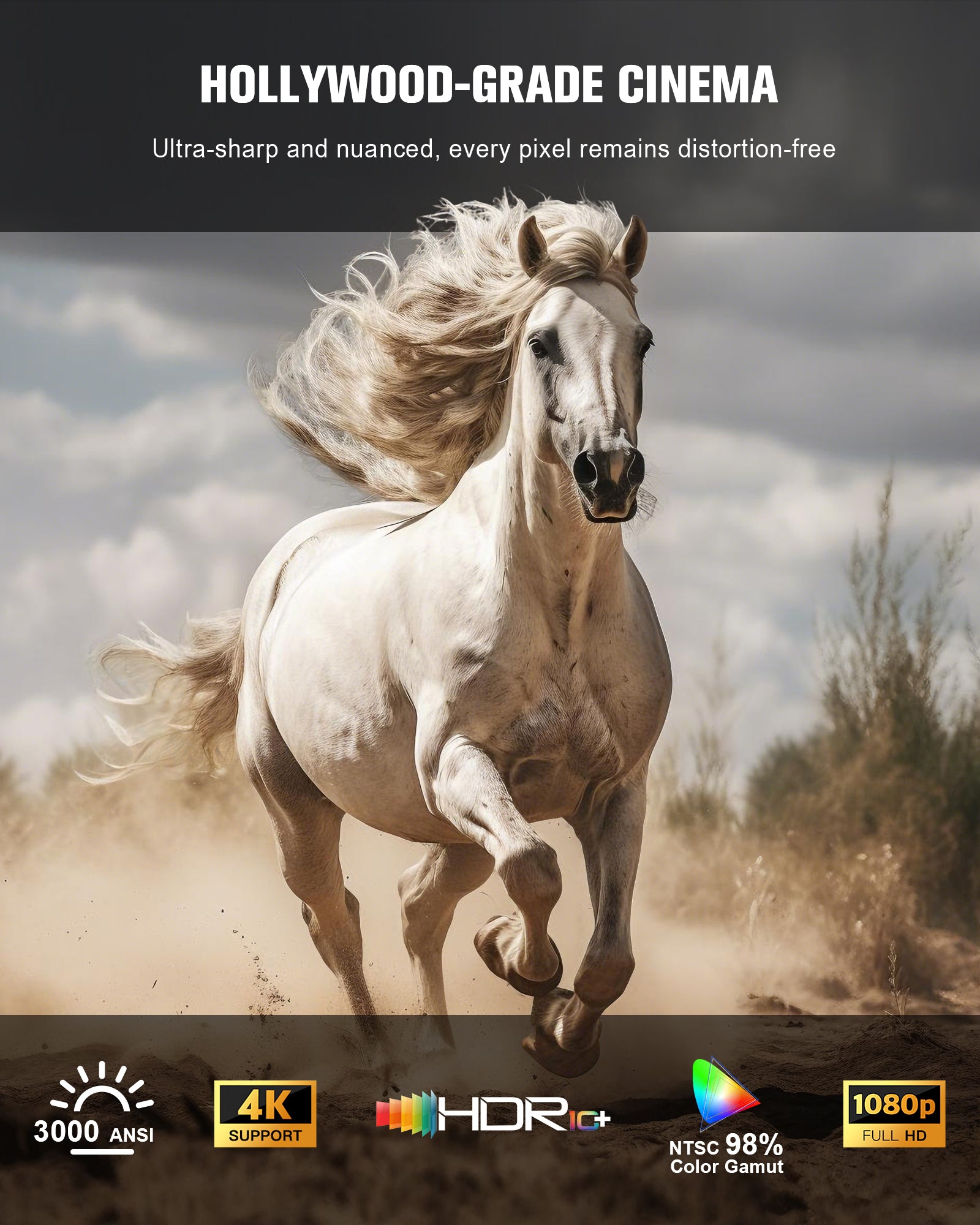 • 【Cinema-Quality HDR Visuals, 4K Decoding & Flexible Projection】 With HDR10 support, it reveals richer contrast and vibrant colors. The 98% wide color gamut delivers near-Hollywood accuracy. The powerful system smoothly decodes 4K UHD content from streaming apps, presenting it in superb 1080P Full HD. The portable design allows for multi-angle rotation for easy ceiling projection or finding the perfect outdoor viewing angle, maximizing the potential of this outdoor projector and indoor projector.