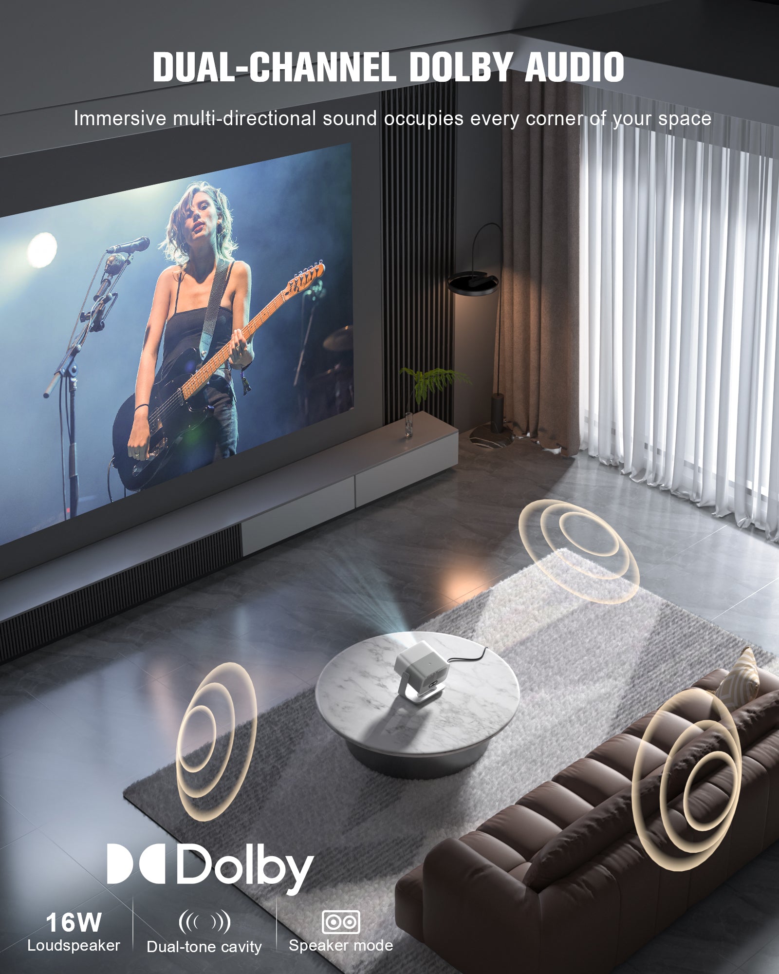 • 【Powerful Dual 8W Speaker System with Dolby Audio】 Fully upgraded audio! Equipped with dual 8W speakers (up from 5W) and dual diaphragms, it delivers a more powerful soundstage and deeper, richer bass. Combined with Dolby Audio technology, enjoy immersive sound that puts you in the center of movies and games, making this gaming projector and movie projector the core of your entertainment.